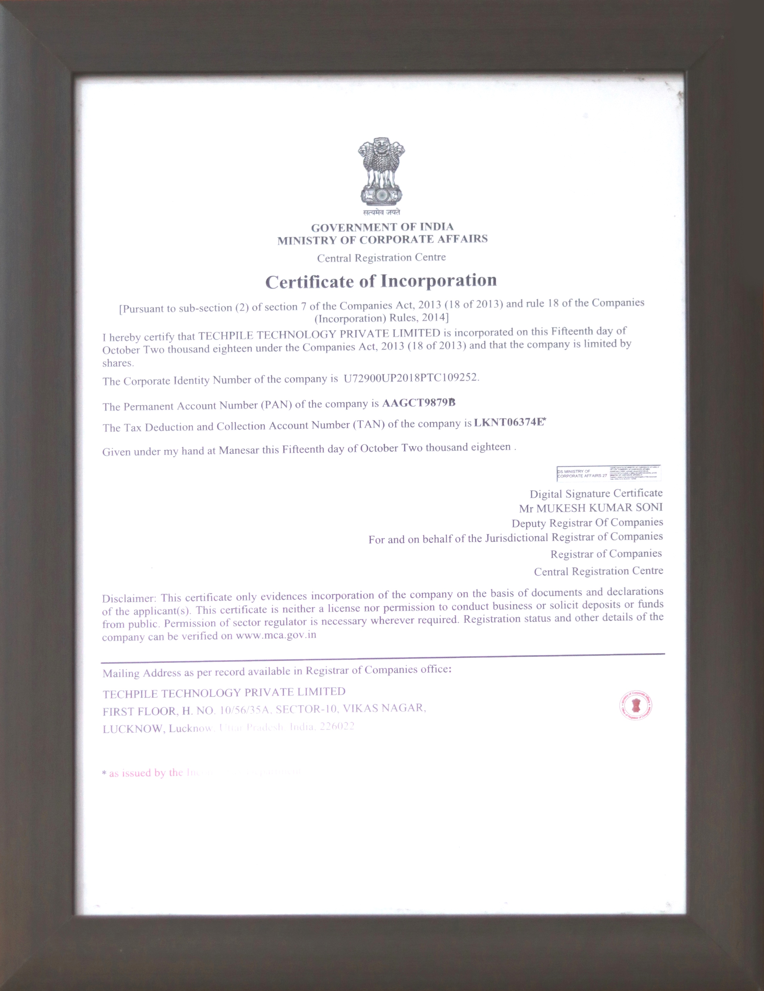 Authorized By Ministry of Corporate Affairs